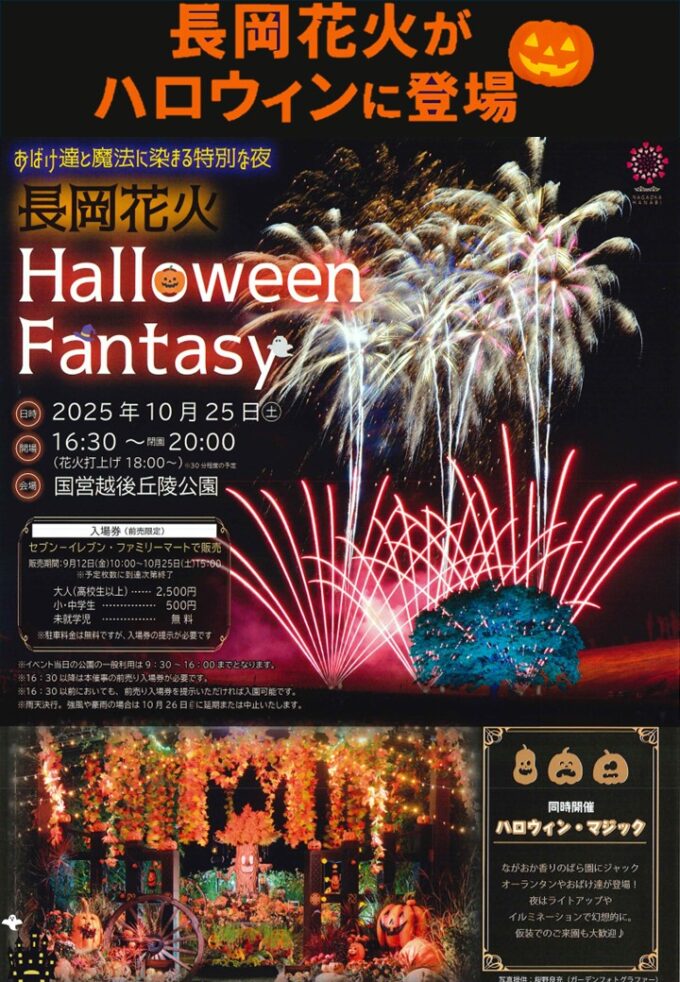 ライトアップされたハロウィン会場で長岡花火が打ちあがります!!